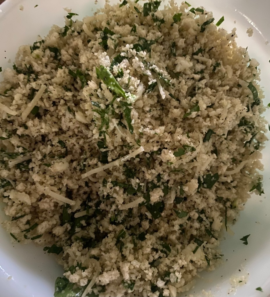 2. In a mixing bowl, combine the panko breadcrumbs, chopped parsley, chopped dill, minced garlic, grated Parmesan cheese, salt, and black pepper. Drizzle in the olive oil and mix until the breadcrumbs are evenly coated and the mixture is well combined.