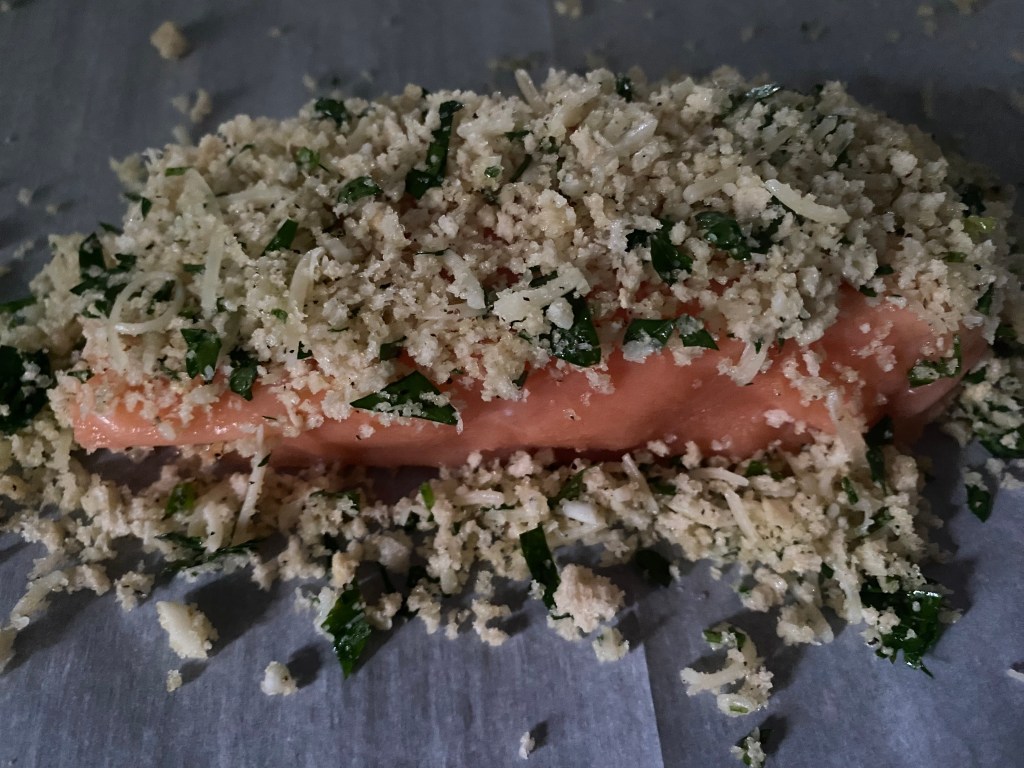 4. Generously top each salmon fillet with the panko mixture, pressing it down gently to adhere.
