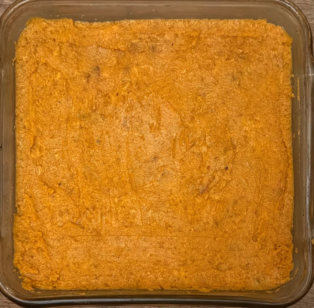 3. Pour the sweet potato mixture into the prepared baking dish, spreading it evenly.