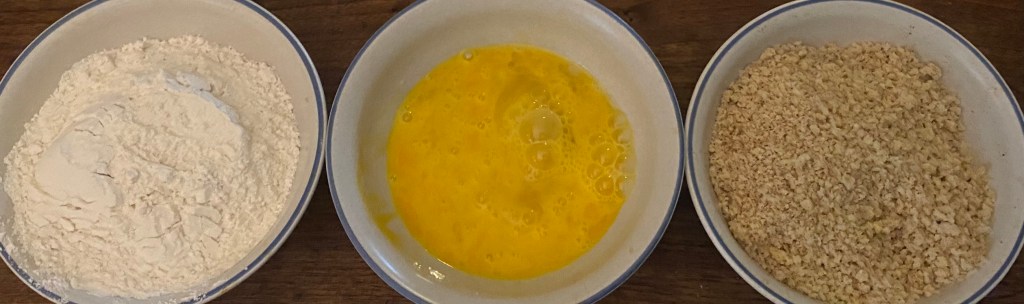 2. In three separate shallow bowls, place the flour in the first bowl, the beaten eggs in the second bowl, and mix the panko breadcrumbs with garlic powder, paprika, salt, and pepper in the third bowl.