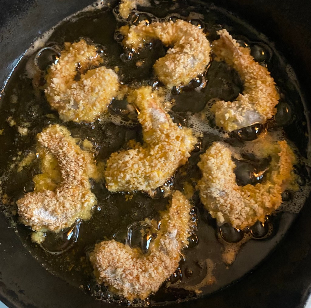 4. Heat oil in a deep skillet or pot over medium-high heat until it reaches about 350°F (175°C). Carefully add the coated shrimp in batches, frying them for about 2-3 minutes on each side or until golden brown and crispy.
