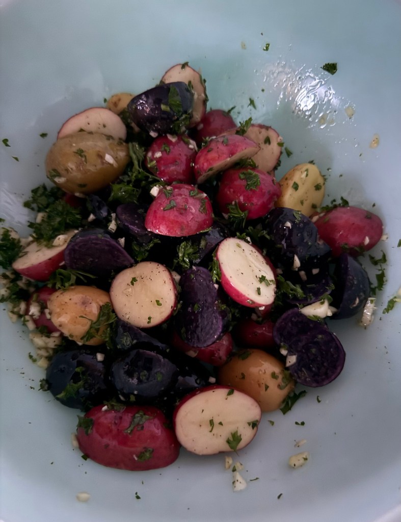 2. In a large bowl, combine the halved baby potatoes, minced garlic, chopped parsley, olive oil, salt, pepper, and dried rosemary (if using). Toss until the potatoes are well coated.