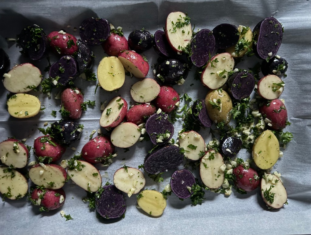 3. Spread the potato mixture in a single layer on a baking sheet lined with parchment paper.