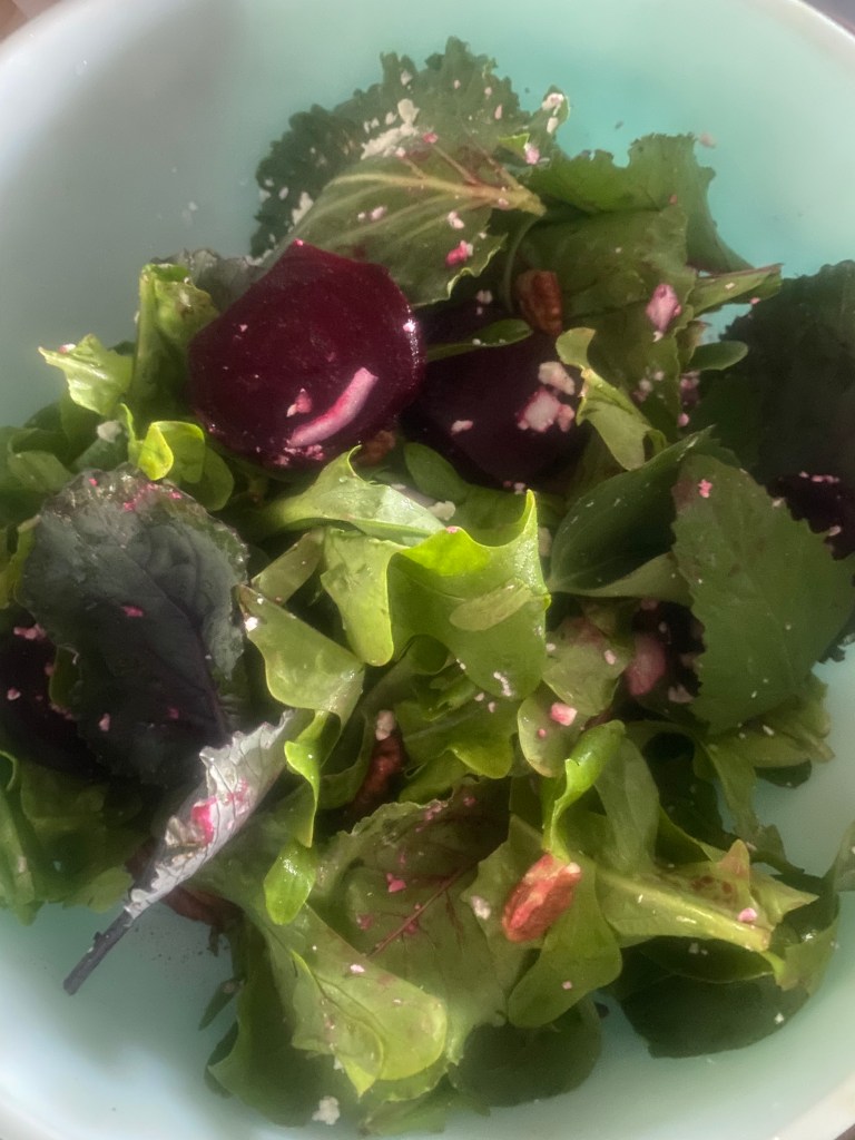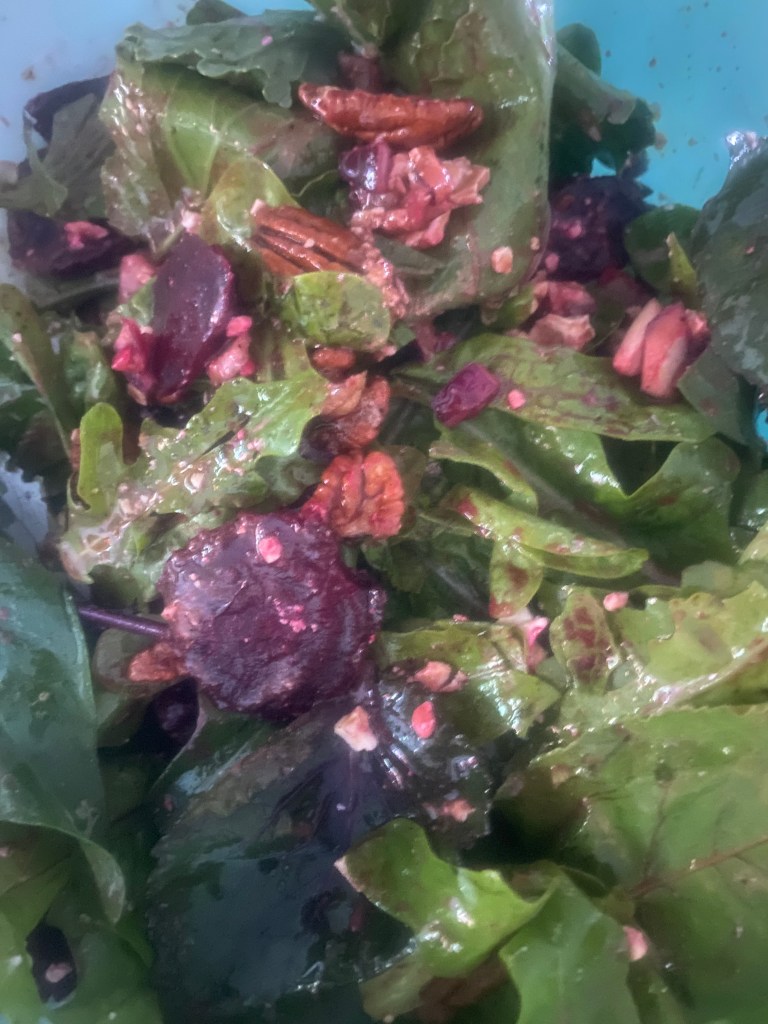 3. In a large salad bowl, combine the mixed greens, roasted beets, sliced red onion, crumbled feta cheese, and toasted nuts.