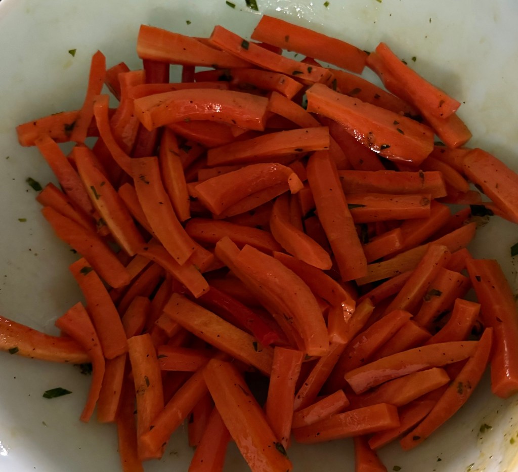 2. In a large bowl, combine the carrots with olive oil, chopped tarragon, honey (if using), salt, and pepper. Toss until the carrots are evenly coated.