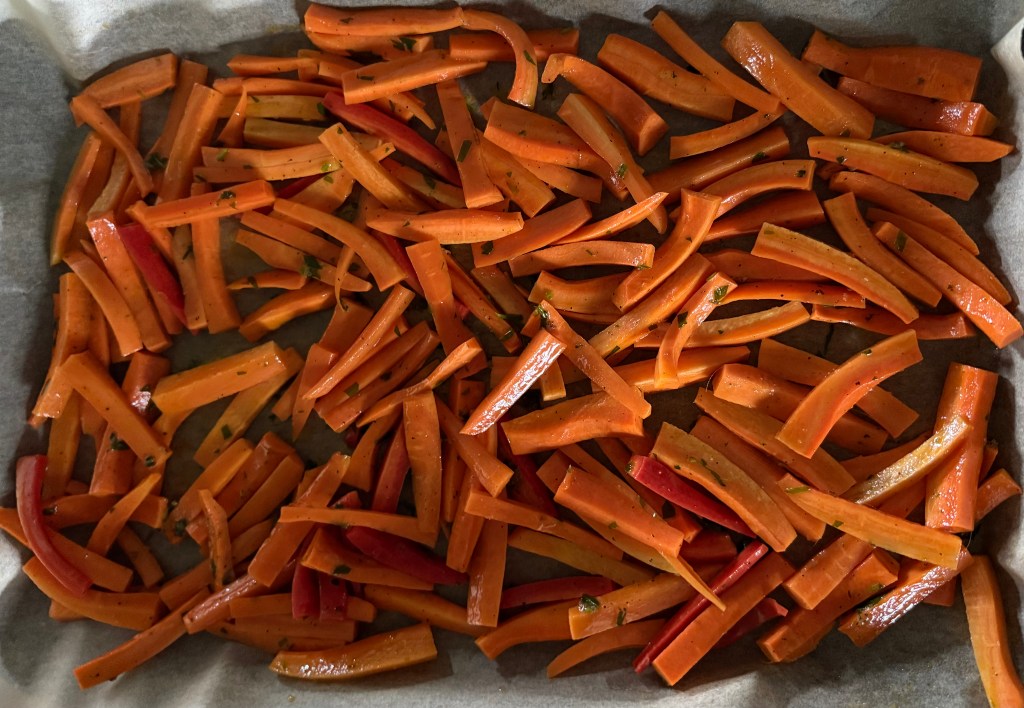 3. Spread the carrots in a single layer on a baking sheet lined with parchment paper.