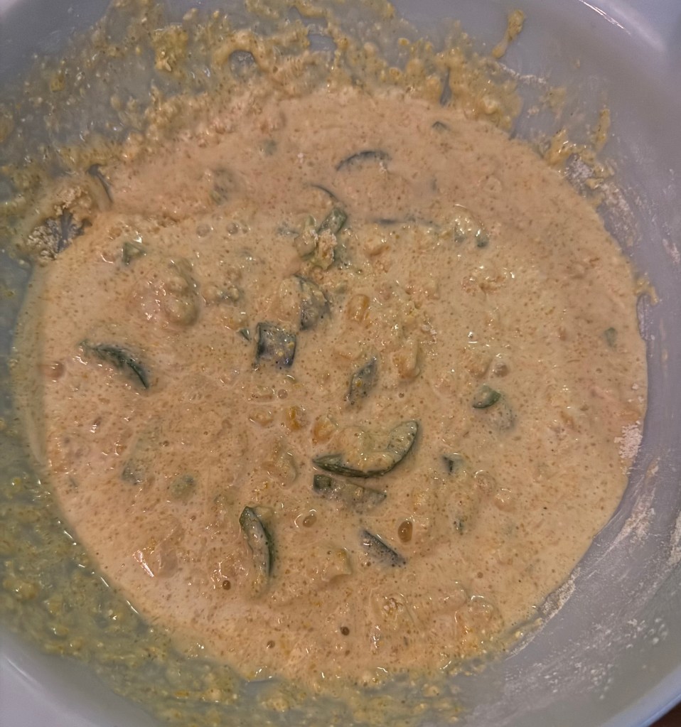 4. Pour the wet ingredients into the dry ingredients and stir until just combined; be careful not to overmix. Gently fold in the chopped jalapeños and corn kernels.