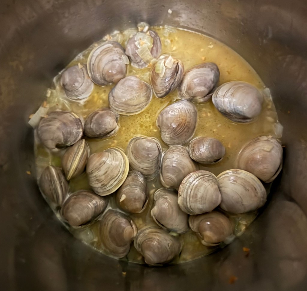 5. Add the cleaned clams to the pot, then cover with the lid. Steam the clams for about 5-7 minutes, or until they have opened up. Discard any clams that remain closed.
