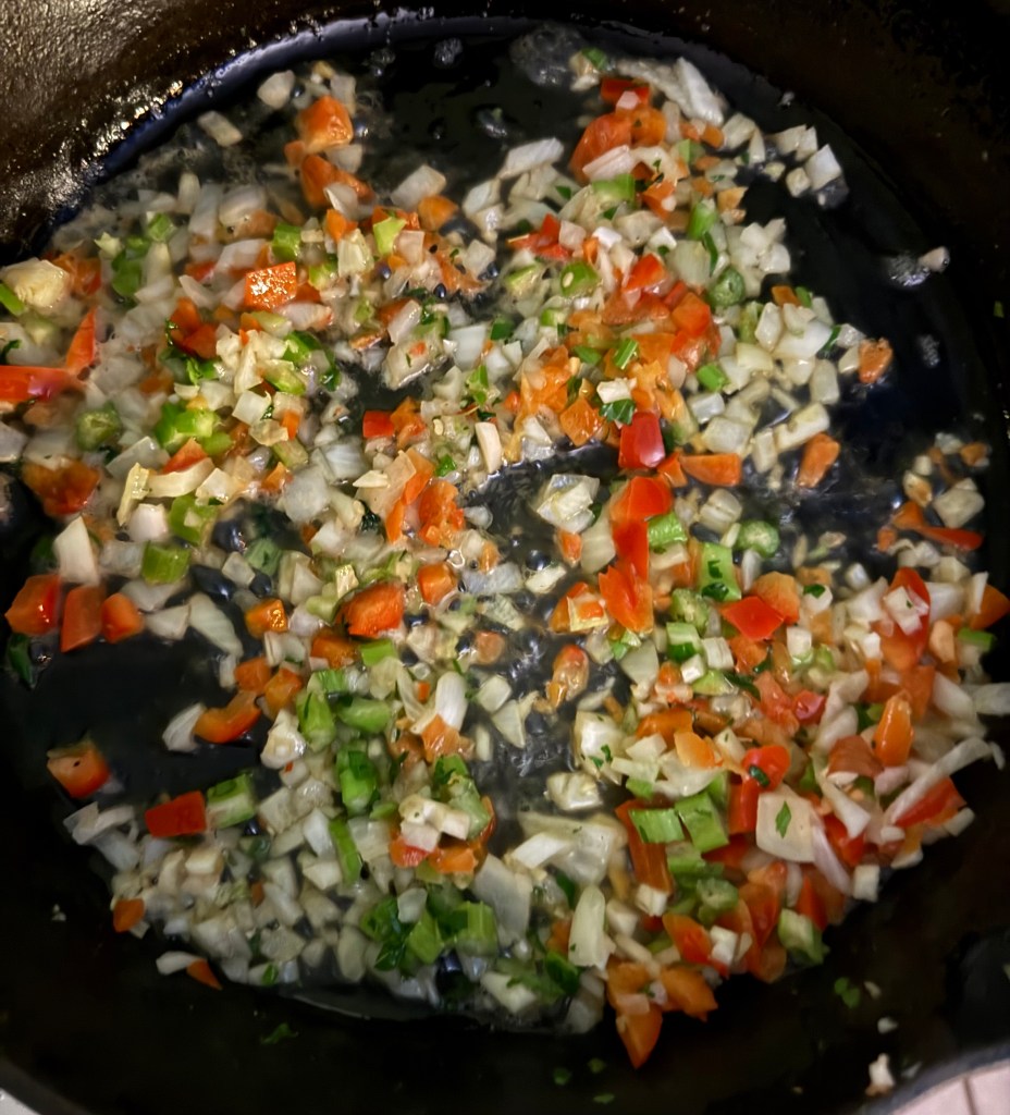 2. In a skillet over medium heat, melt the butter. Add the chopped onion, celery, and red bell pepper, and sauté for about 5 minutes, or until the vegetables are softened. Stir in the minced garlic and cook for another minute.
