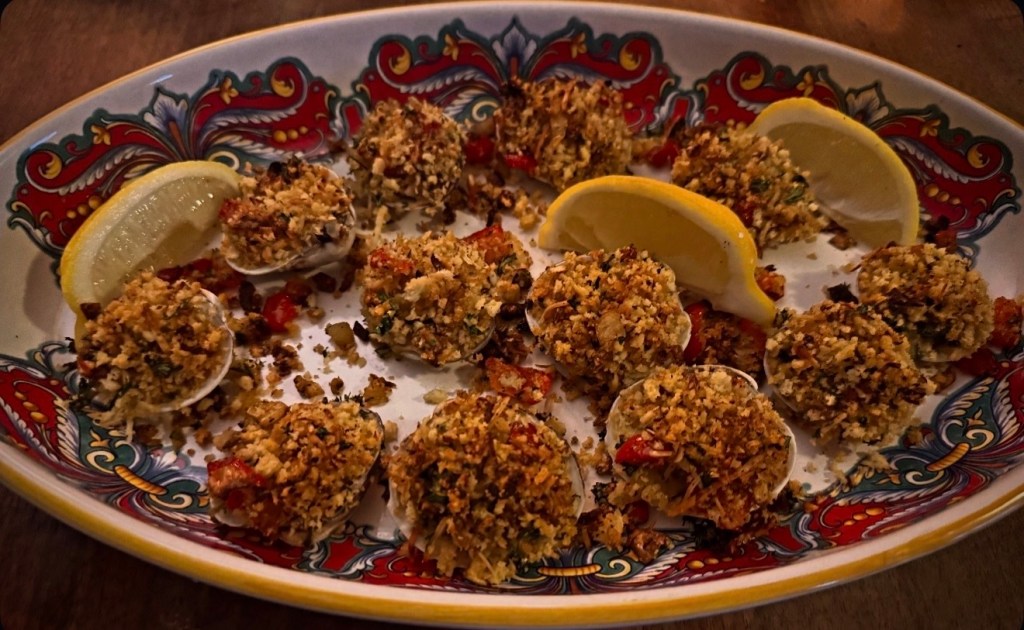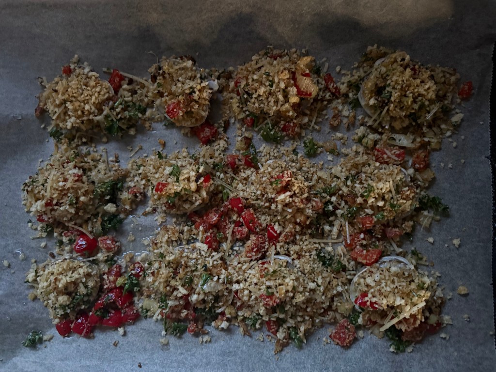 4. Place the opened clams on a baking sheet, keeping them in their shells. Spoon the breadcrumb mixture generously over each clam, pressing it down slightly to adhere.