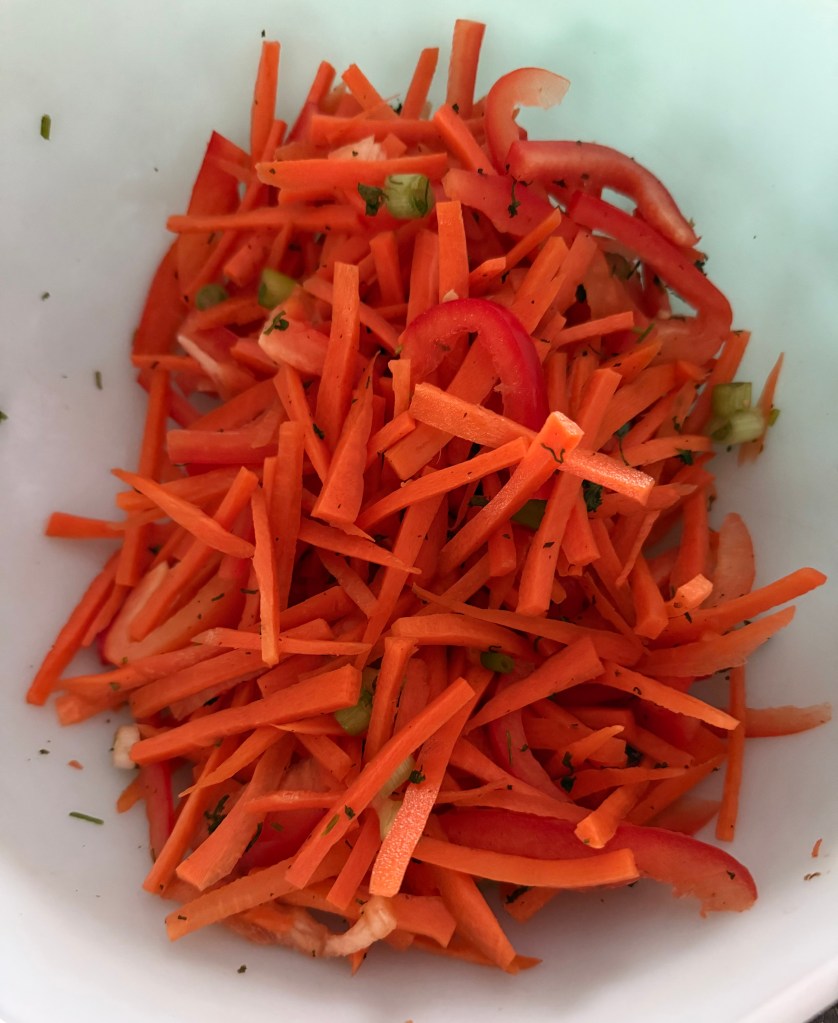 1. In a large mixing bowl, combine the grated carrots, sliced bell pepper, chopped cilantro, and green onions.