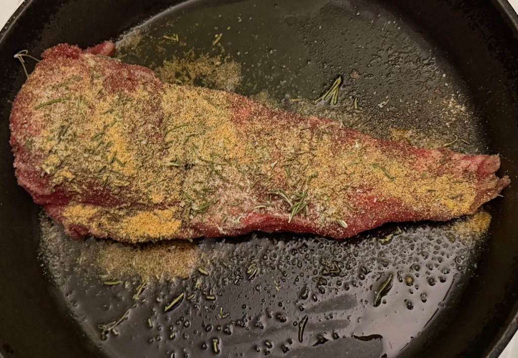 4. Sear the beef tenderloin on all sides until browned, about 3-4 minutes per side.