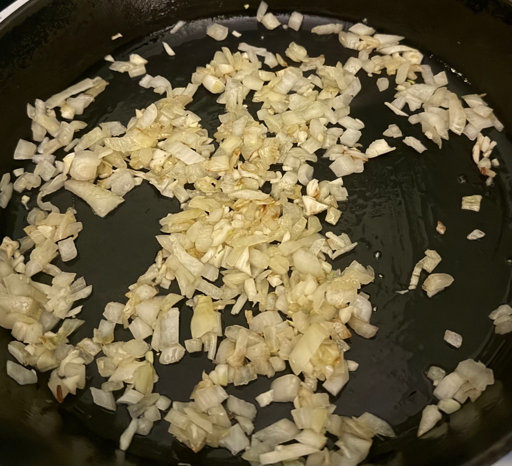 2. In a large skillet or saucepan, heat the olive oil or butter over medium heat. Add the chopped onion and sauté for about 5 minutes, or until softened and translucent.