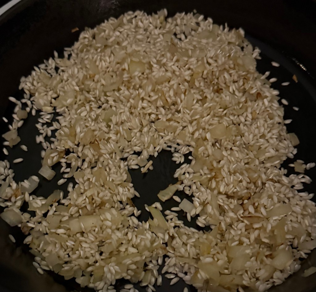 4. Add the Arborio rice to the pan, stirring to coat the grains with the oil and toasting them for about 1-2 minutes.