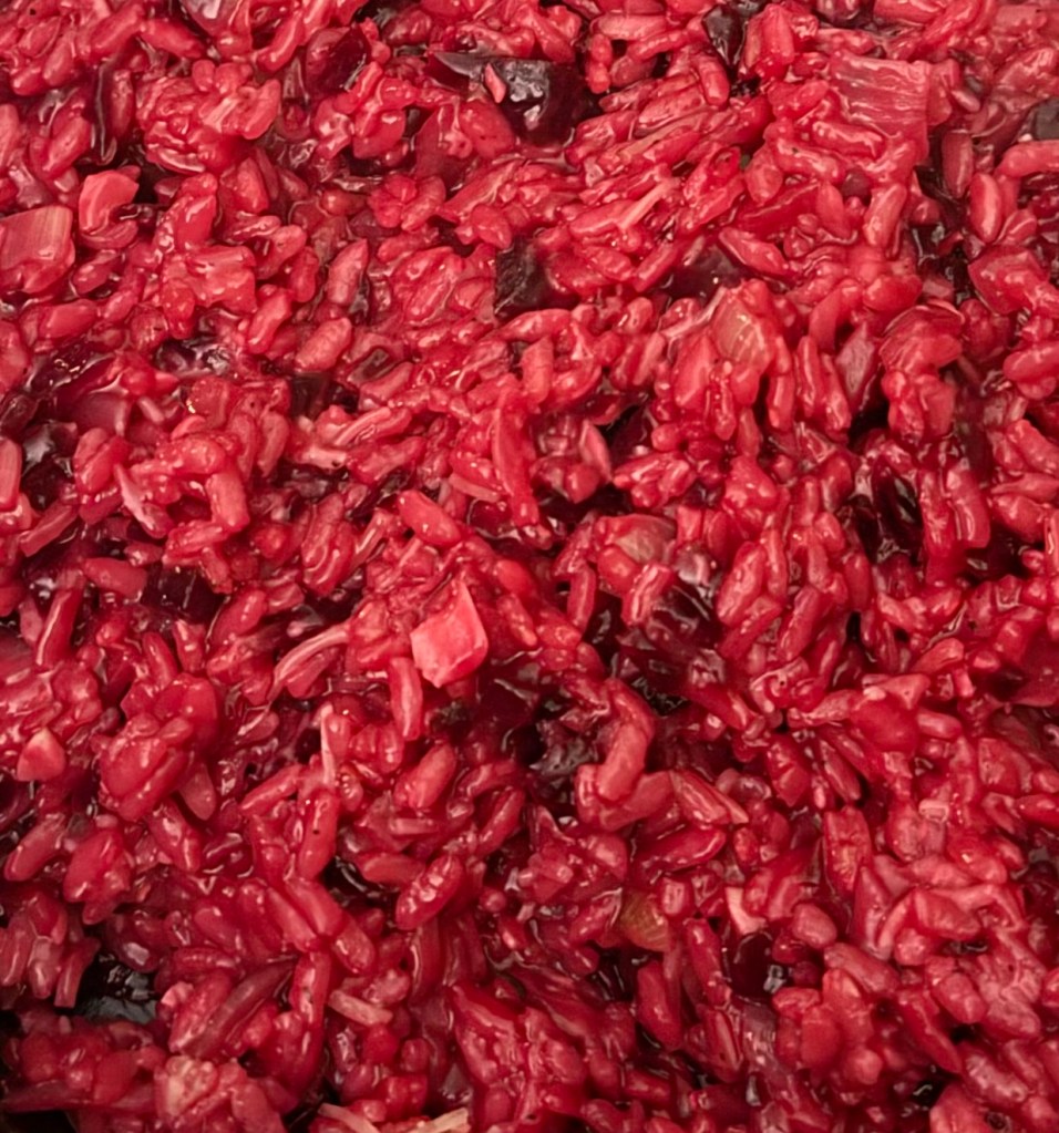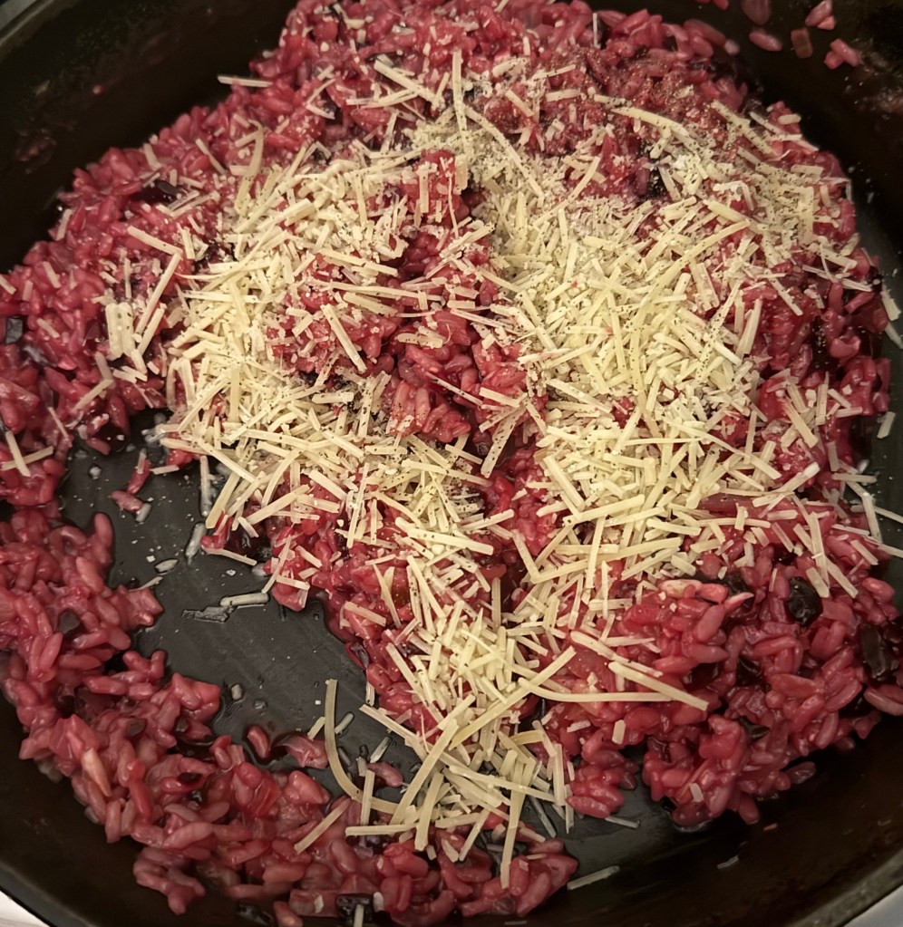 7. When the rice is nearly done, stir in the grated beets, allowing them to warm through and incorporate into the risotto.
