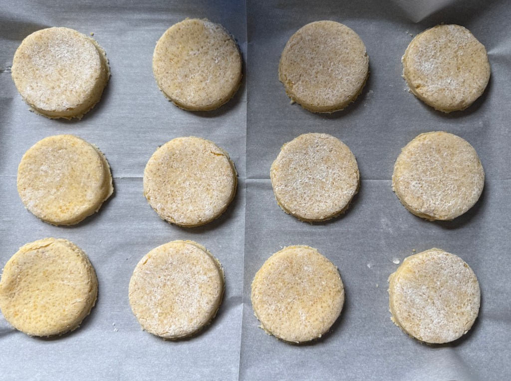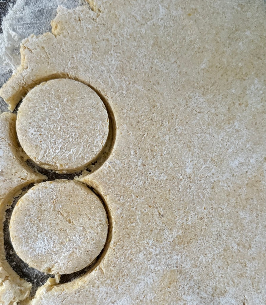 6. Pat the dough to about 1/2-inch thickness and use a biscuit cutter to cut out biscuits. Place them on the prepared baking sheet, close together but not touching.