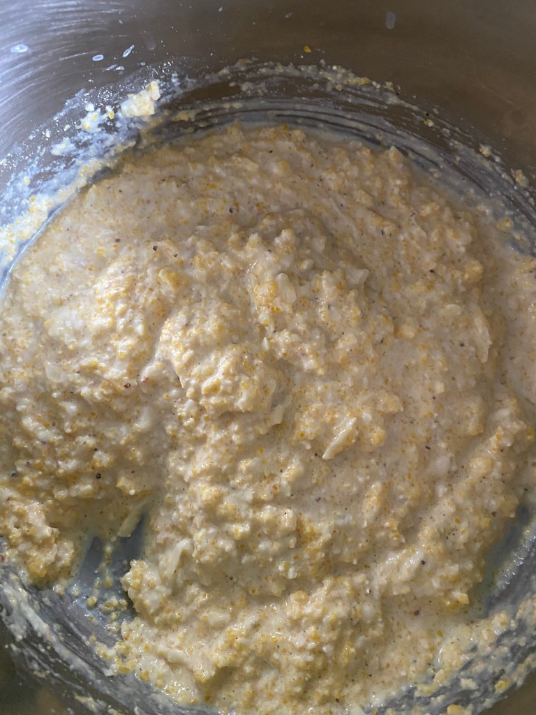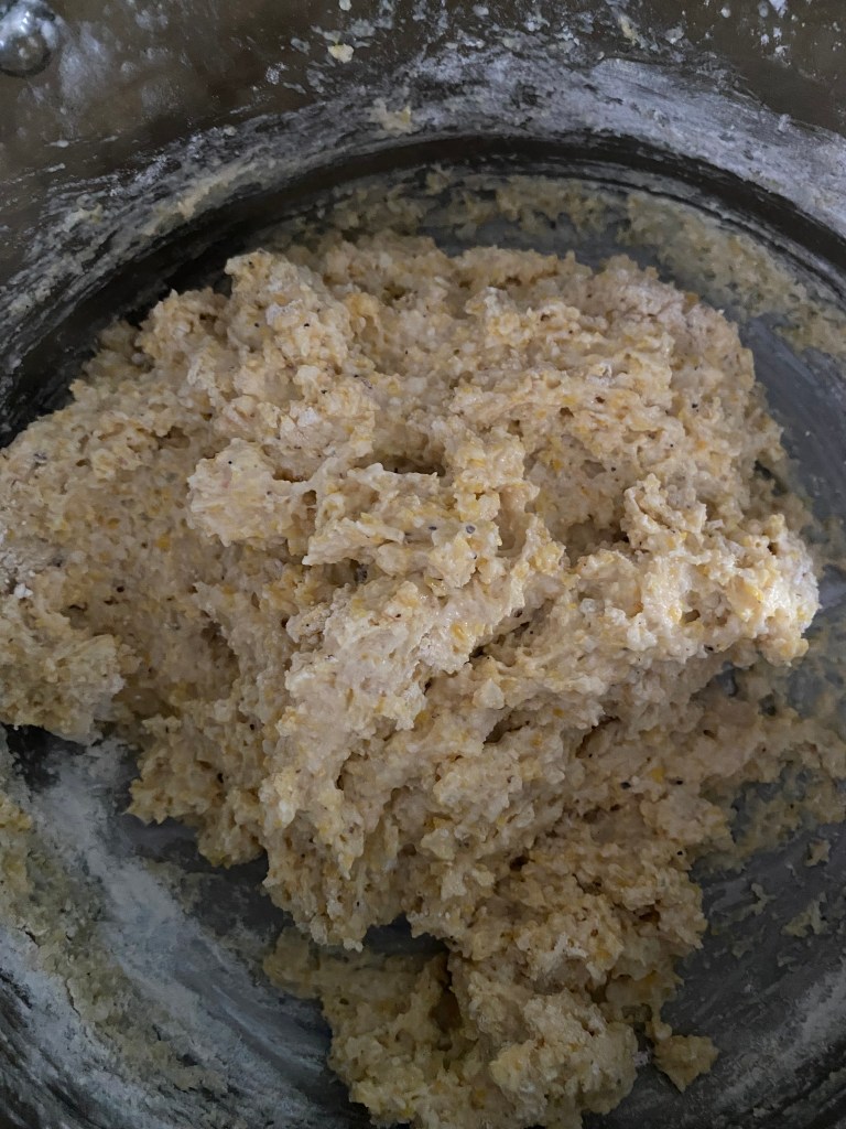 5. Slowly add the flour mixture to the cornmeal and cheese mixture, stirring until a dough forms.