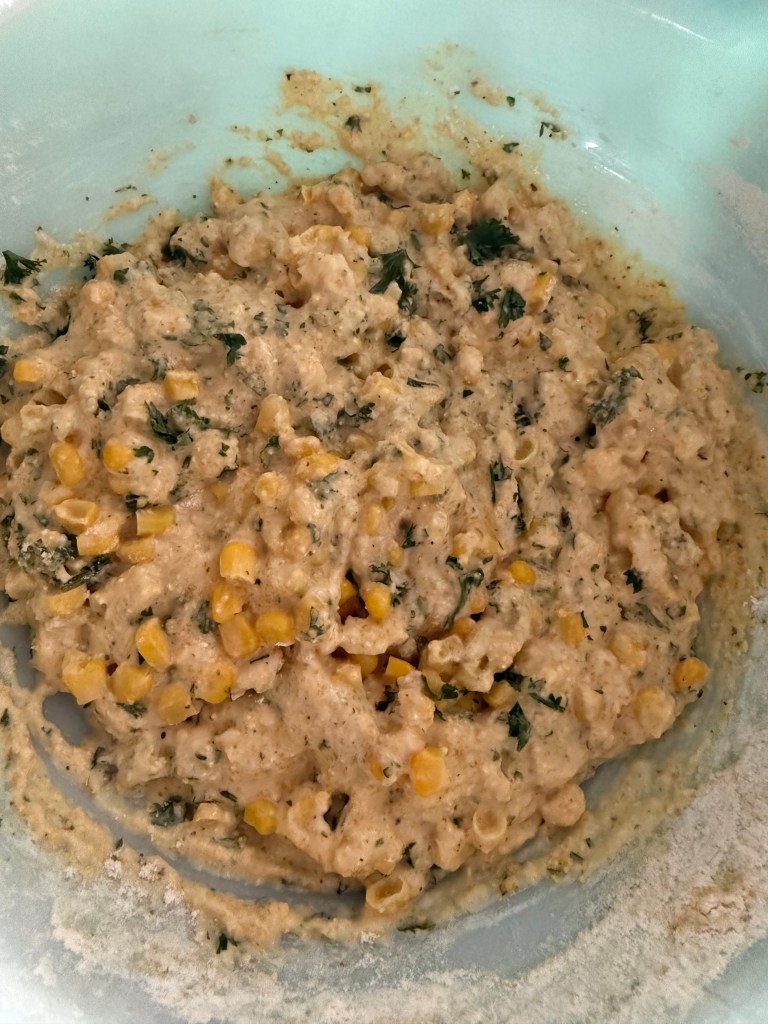 3. Pour the wet ingredients into the dry ingredients and stir until just combined. Gently fold in the corn kernels and chopped herbs.