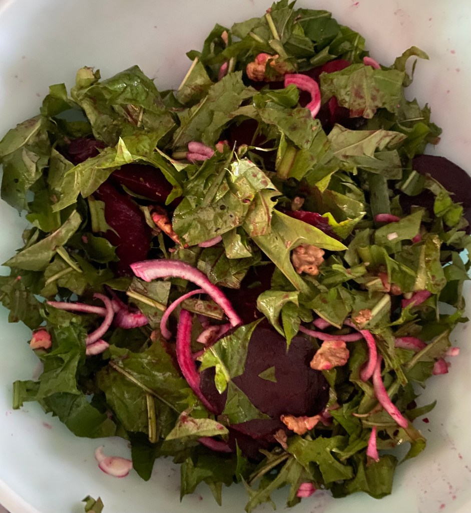 1. In a large salad bowl, combine the dandelion greens, roasted beets, red onion, and walnuts or pecans (if using).