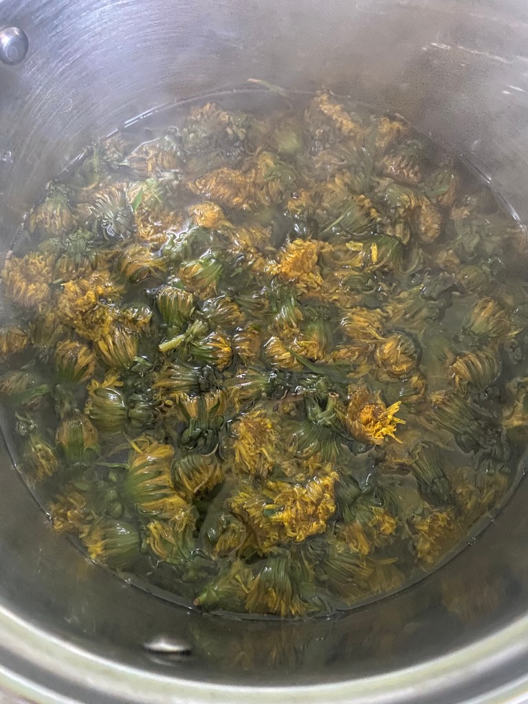 2. Add the washed dandelion flowers to the boiling water, cover, and simmer for about 10-15 minutes.