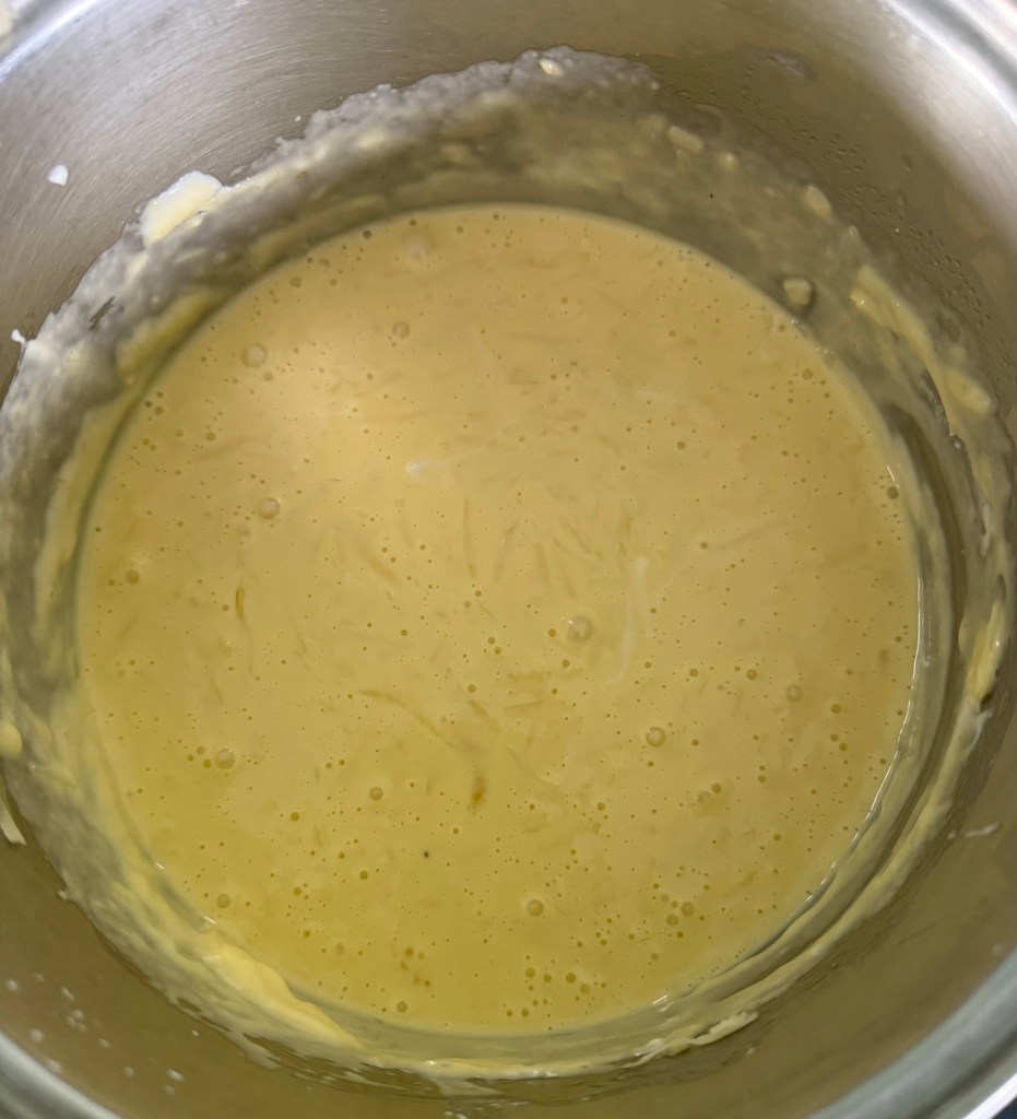 3. Once the mixture is hot, remove it from the heat and add the tapioca flour, stirring until well combined. The mixture will be thick and sticky.