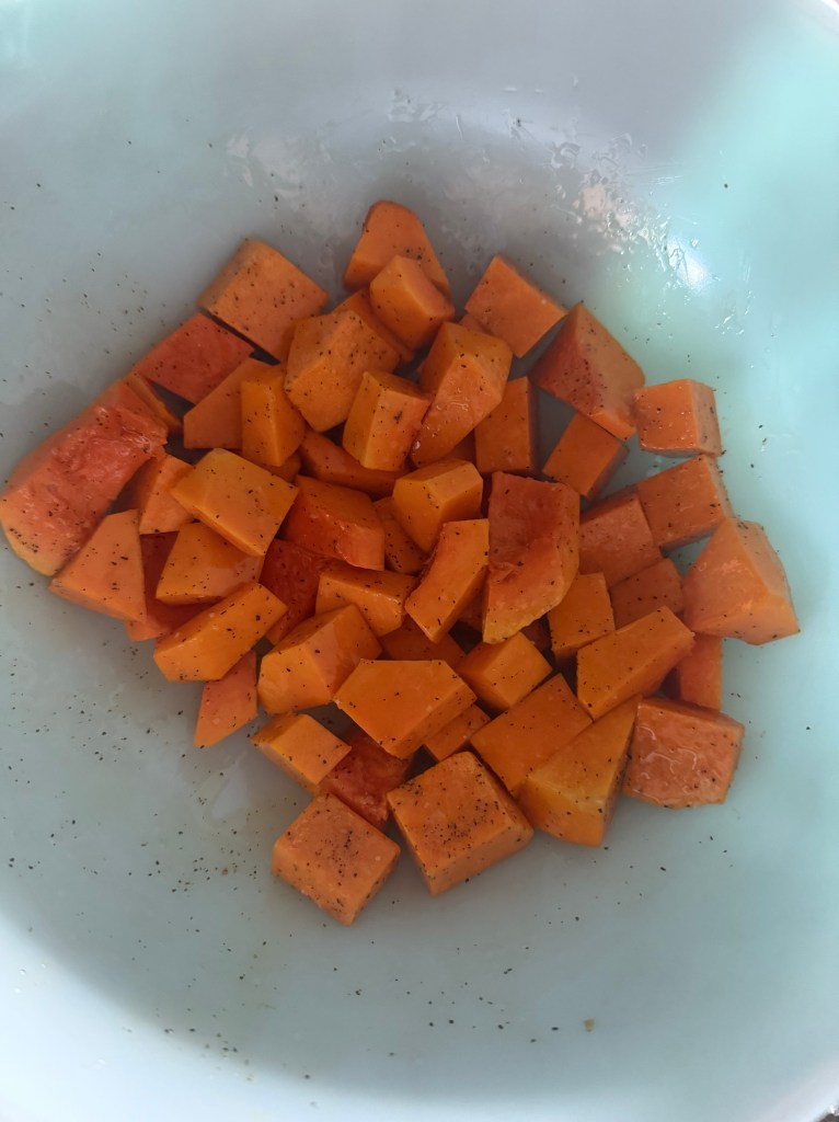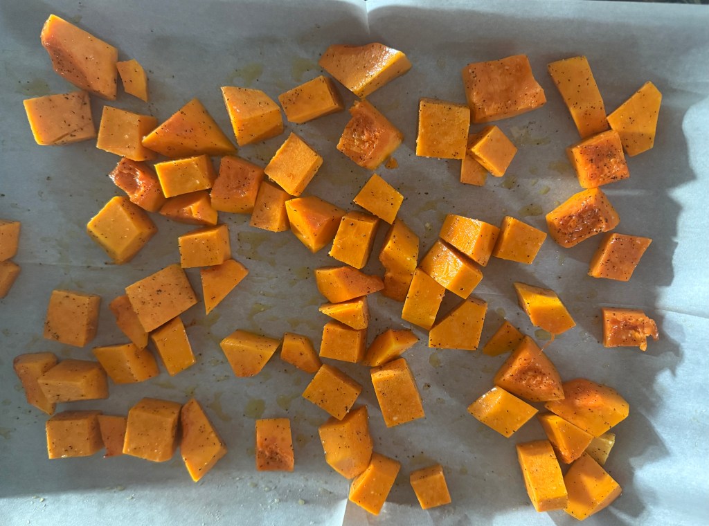 2. Toss the cubed pumpkin with 1 tablespoon of olive oil, salt, pepper, and ground cinnamon. Spread it in a single layer on a baking sheet and roast for 25-30 minutes, or until tender and lightly caramelized.