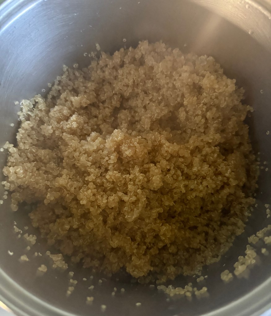 3. While the pumpkin is roasting, cook the quinoa. In a saucepan, combine the rinsed quinoa and water or vegetable broth. Bring to a boil, then reduce heat to low, cover, and simmer for about 15 minutes, or until the quinoa is fluffy and the liquid is absorbed.
