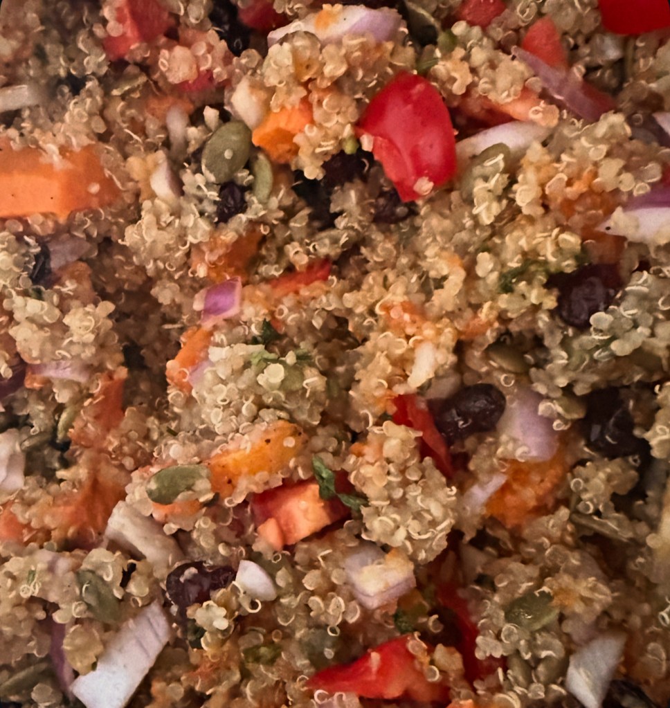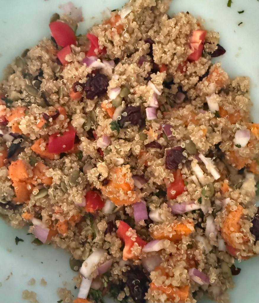 4. In a large bowl, combine the cooked quinoa, roasted pumpkin, red onion, bell pepper, dried cranberries, pumpkin seeds, and fresh herbs.