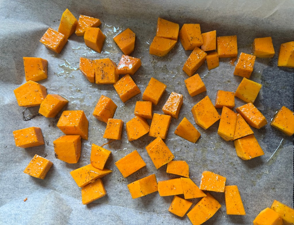 2. Toss the cubed pumpkin with olive oil, salt, and pepper, then spread it in a single layer on a baking sheet.