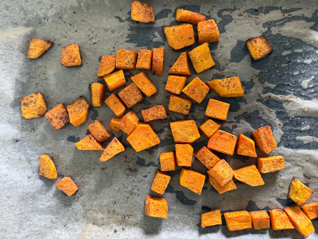 3. Roast in the preheated oven for 25-30 minutes, or until the pumpkin is tender and lightly caramelized, stirring halfway through.