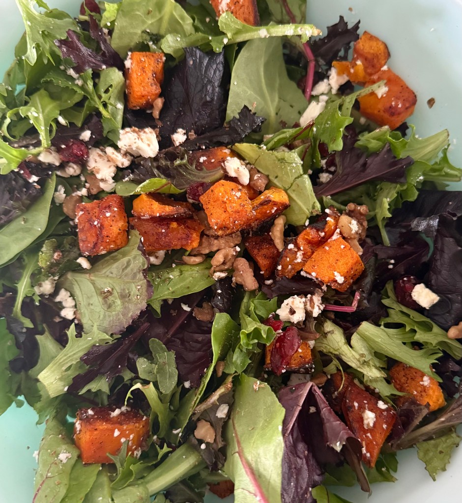 4. In a large bowl, combine the mixed greens, roasted pumpkin, feta cheese, toasted nuts, and dried cranberries or pomegranate seeds.