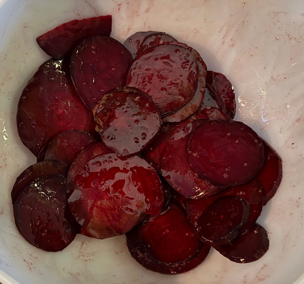 - 2 medium beets, peeled and thinly sliced (about 1/8 inch thick)