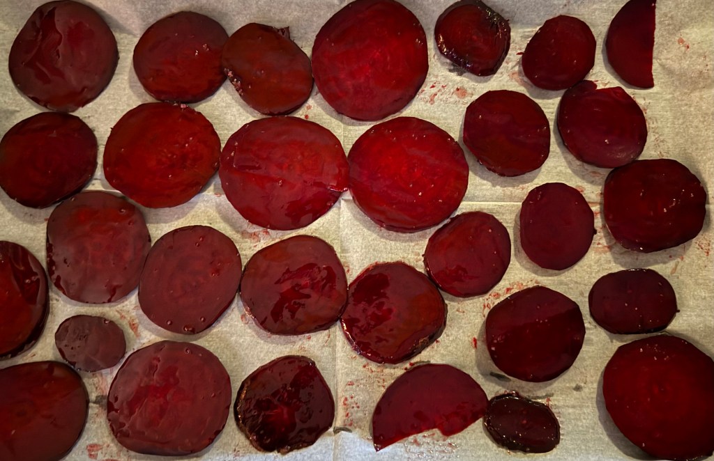 5. Once done, remove the beet chips from the oven and let them cool on the baking sheet for a few minutes; they will continue to crisp up as they cool.