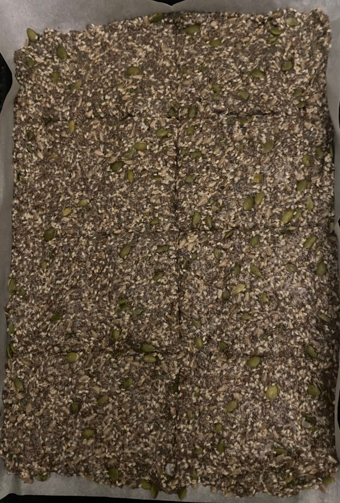 9. Remove from the oven and let cool before breaking into pieces. Enjoy your homemade seed crackers!