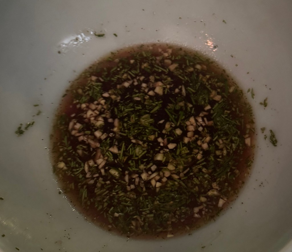 2. In a bowl, whisk together the pomegranate juice, pomegranate molasses, chopped rosemary, minced garlic, olive oil, salt, and pepper.
