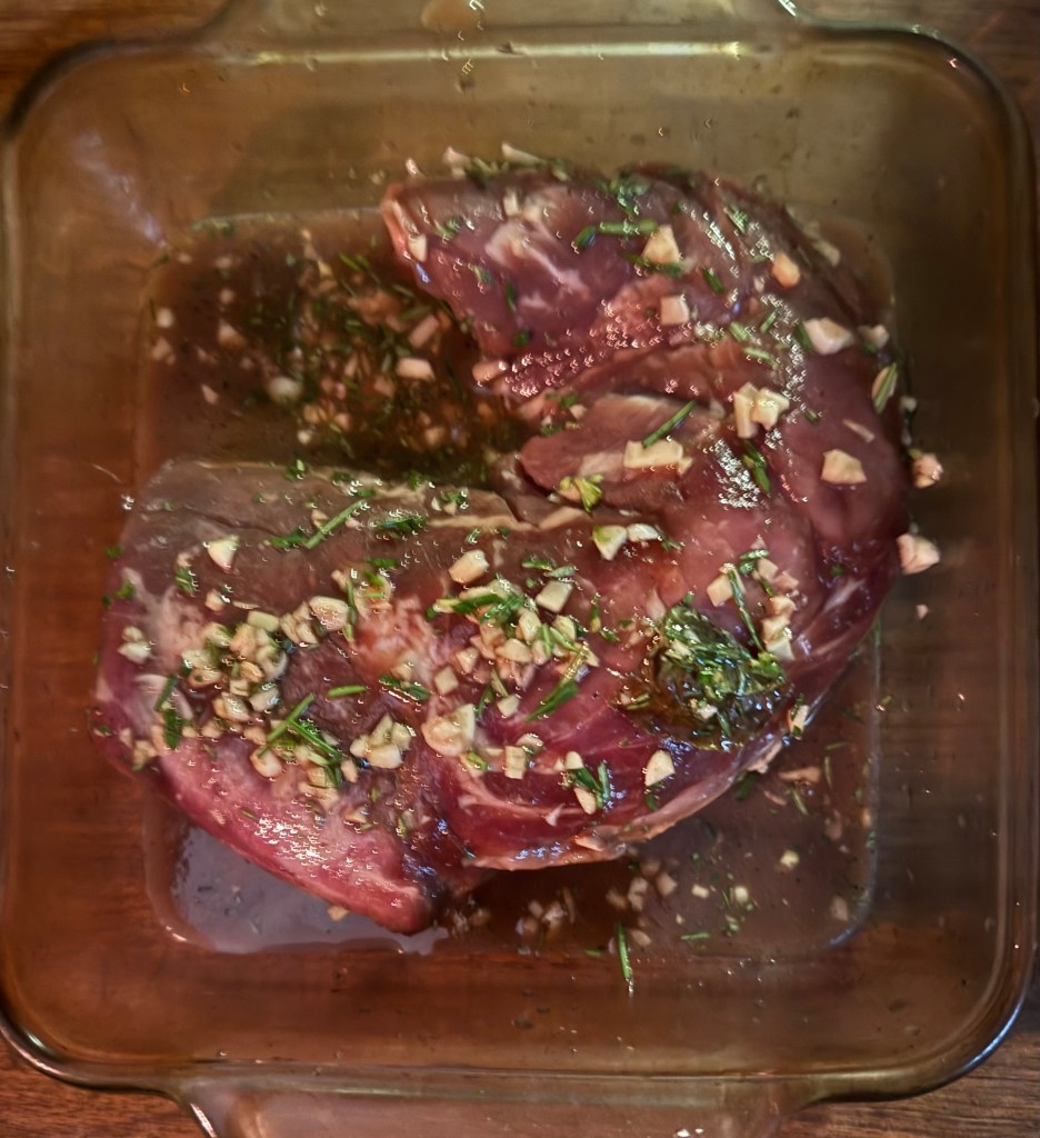 4. Remove the pork from the marinade and place it in a roasting pan. Reserve the marinade for basting.