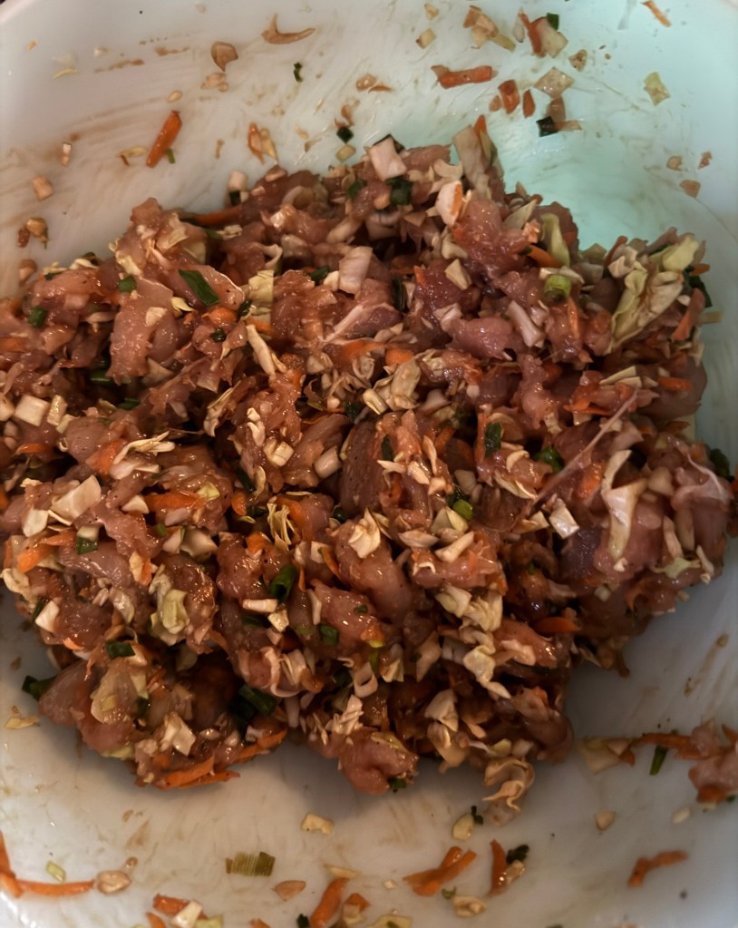 1. In a large mixing bowl, combine ground chicken, chopped cabbage, shredded carrots, green onions, minced garlic, and ginger.