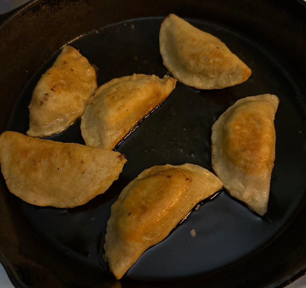 2. Place the dumplings in the skillet, flat side down, and cook for about 3-5 minutes until the bottoms are golden brown.