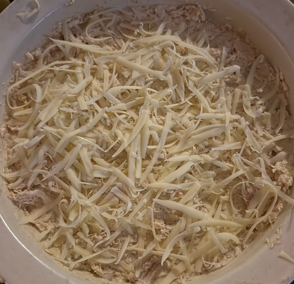 - In a mixing bowl, combine the shredded chicken, softened cream cheese, sour cream, and buffalo wing sauce.