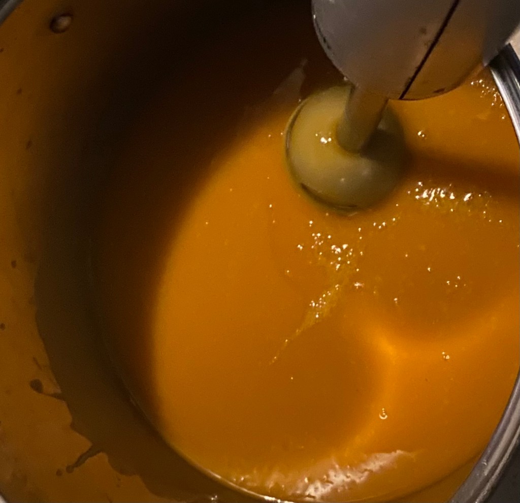 - Use an immersion blender to crush the orange juice ice cubes until slushy