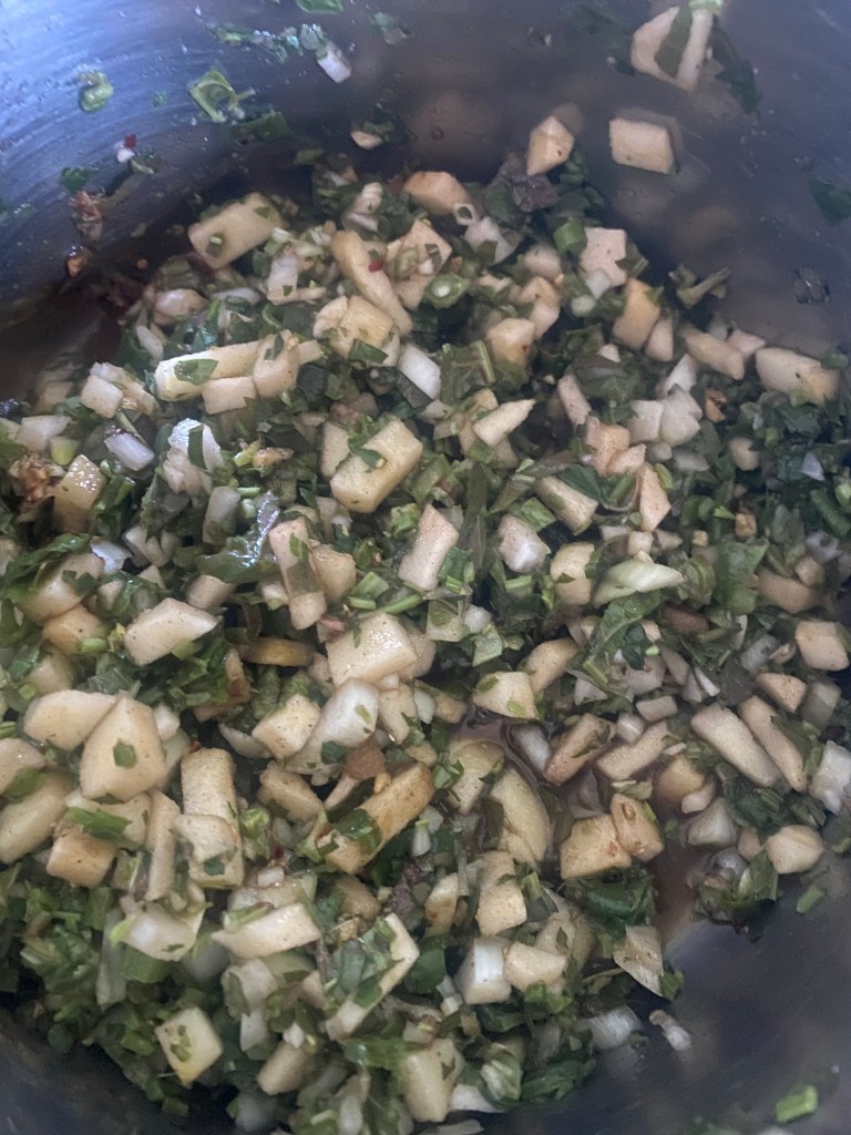 1. Ensure all the ingredients are prepped: chop the knotweed, onion, and apple, and have the ginger and garlic ready.