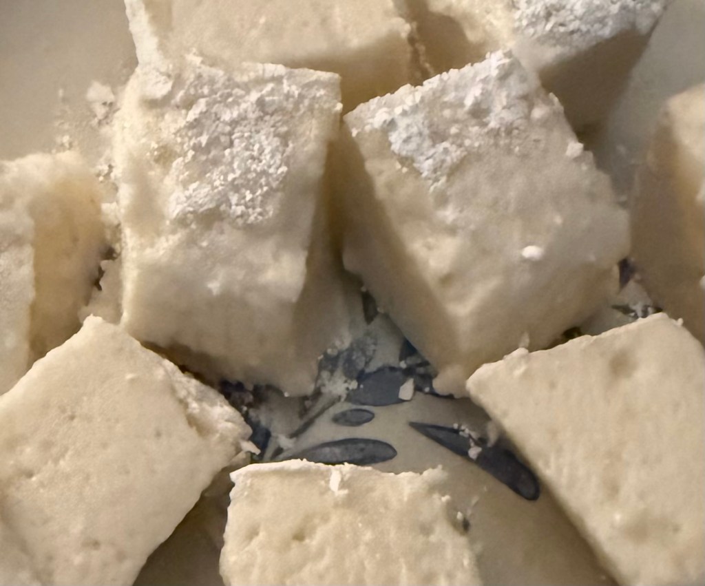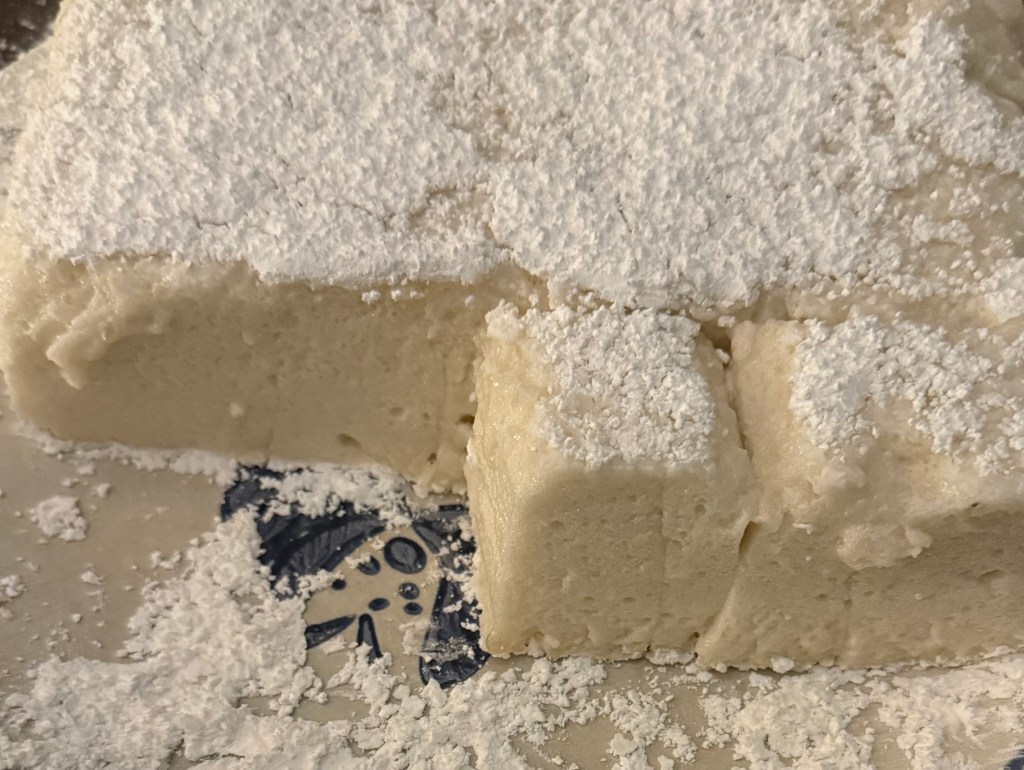 7. Once set, remove the marshmallow slab from the pan. Cut into desired shapes with a sharp knife or cookie cutters, dusting with additional powdered sugar and tapioca flour if sticky.