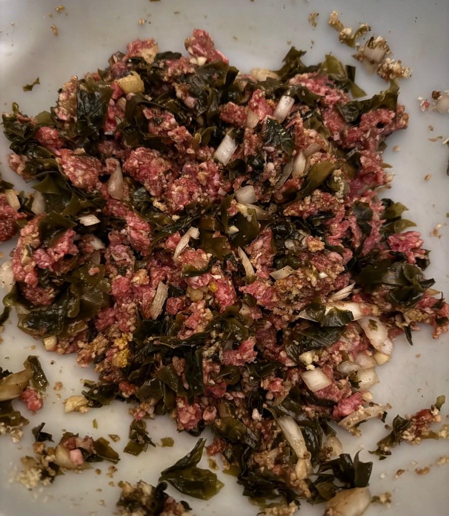 2. In a large mixing bowl, combine the ground meat (or plant-based alternative), chopped wakame, breadcrumbs, chopped onion, minced garlic, egg (or flax egg), soy sauce, sesame oil, black pepper, and salt. Mix well until all ingredients are evenly combined.